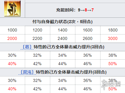 付予〔混沌〕特性的己方全体:暴击威力提升30%~50%(3回合)。